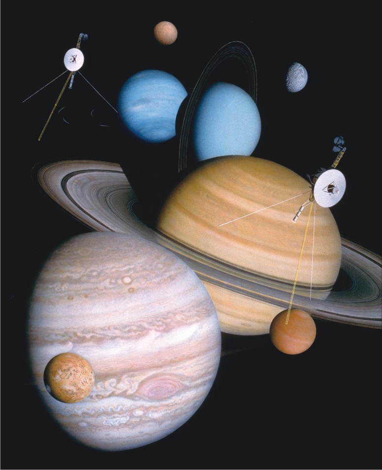 两艘无人飞船传回的数据达5万亿比特,发回了10万张精美照片,这些信息相当于6000套《不列颠百科全书》的容量,平均每个地球人可以分得700比特信息。两个“旅行者”在三十年间所采集的行星信息,比过去几个世纪天文学家获得的行星知识加起来还要多。