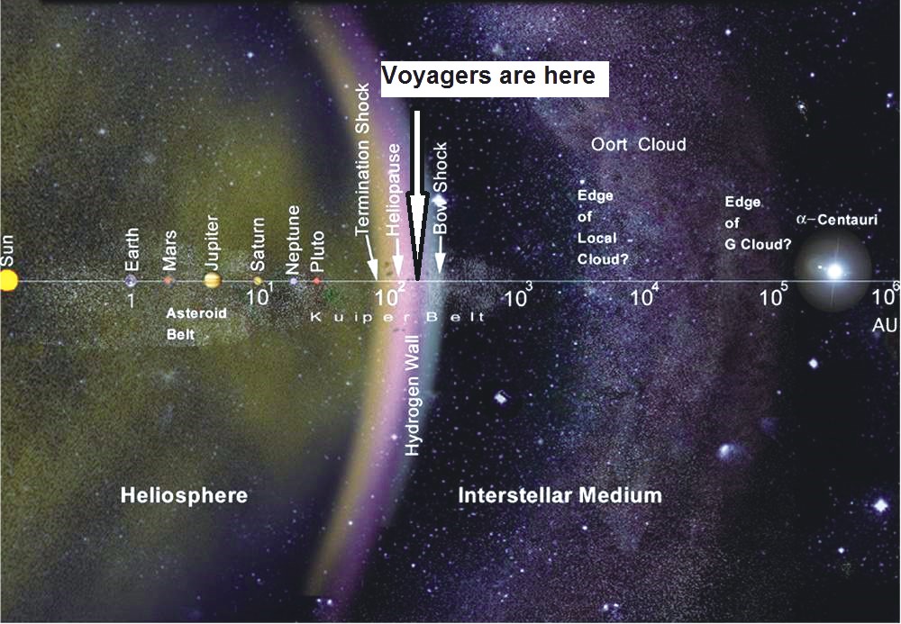过去两年间,“旅行者”1号到底身处何地,曾引发科学界的激烈争论。科学家们一直在尝试采用各种不同的检测方法弄明白它周围的环境发生了哪些变化。后来他们发现,2012年8月25日飞船周围太阳发出的带电粒子数量下降,而银河系宇宙线数量上升。这意味着,“旅行者”已经离开了日球层(包裹在太阳周围的一个由炽热高能粒子构成的气泡)的怀抱,进入从来没有被探索过的寒冷的空间。这里与预期中的星际空间环境相符,而与太阳周围的环境完全不同。换句话说,飞船从那时起就驶入了一片全新区域。这一天即是“旅行者”1号抵达星际空间的日子。