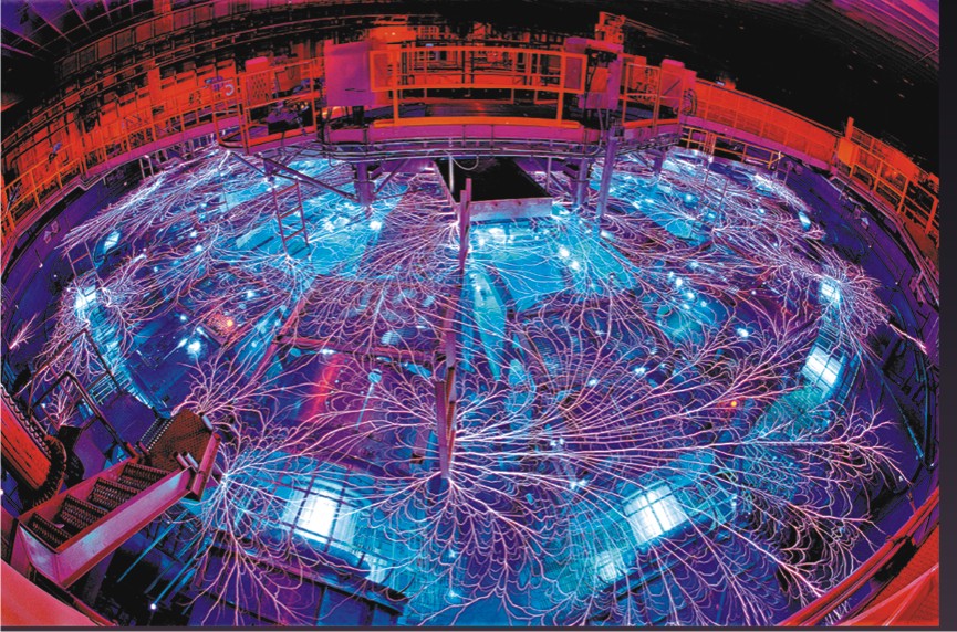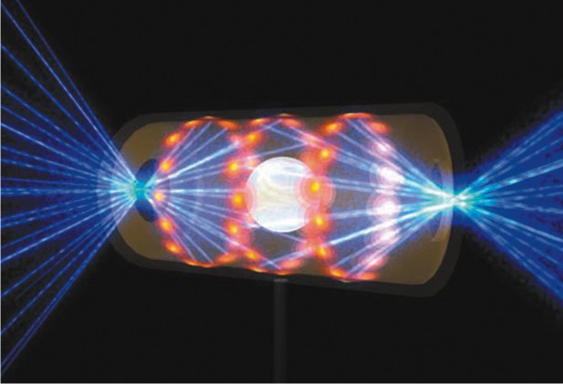 这个小球是人类能够制造出来的形状最完美的球体之一。当192束激光同时击中这个小球时,金属外壳将会瞬间蒸发,产生的反作用力将填充的氢同位素瞬间加温加压到如同在太阳核心的程度,产生一个持续时间为十亿分之五秒的小太阳,同时放出多得难以想象的能量。这是另一种产生受控核聚变的方式,虽然目前看起来还不太成熟——如果要产生持续的能量供应,需要每秒钟引爆十颗左右的小球,而目前每天只能引爆一颗——不过这一点完全不用担心,因为技术发展大都比我们想象中要来得快得多。