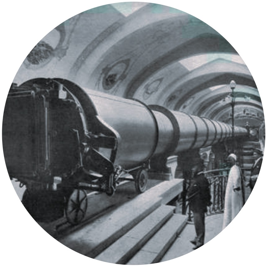 1851年伦敦世博会上,著名的罗斯天文望远镜和库克天文望远镜巍然雄踞在水晶宫中央。1867年巴黎世博会的西克雷坦公司大型天文望远镜、1876年费城世博会的海军天文台望远镜,都点染着展区的现代气息和科技品位。1893年芝加哥世博会上,叶凯士望远镜的镜片尚未打磨成功,便迫不及待向公众展示了18米长的镜筒和18吨重的镜身。最轰动一时的望远镜出现在1900年巴黎世博会上,这是法国人德隆科尔制造的长60米、口径1.25米的“观天巨眼”。超高超重的身躯根本无法竖起,只能横卧在离地面7米高的水平支架上,靠一面镜子反射输入光线。这架望远镜完全是为世博会展览制作的,并没有考虑实用性,世博会闭幕后找不到一家买主,只能以解体告终,仅剩下硕大的镜头还保存在巴黎天文台,成为望远镜制造历史上科研与经营双重失败的典型案例。