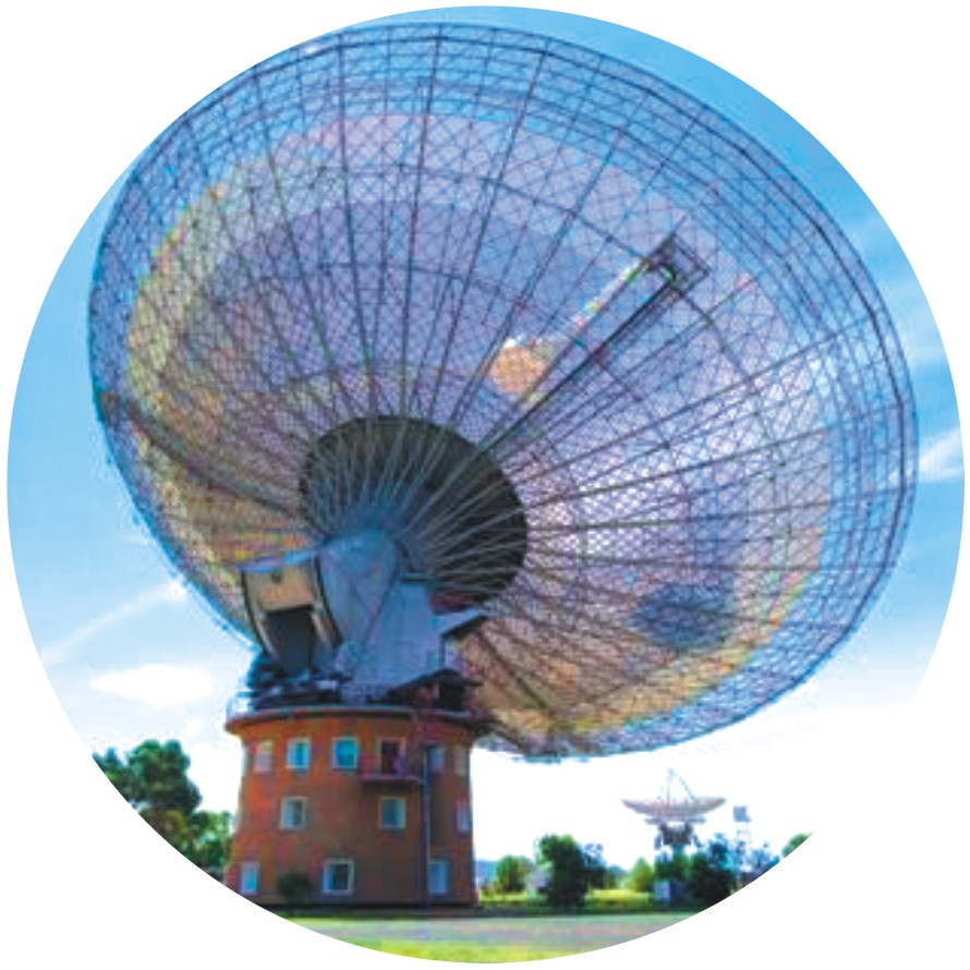 人类眼中的“万紫千红”原来只是电磁波中380纳米到750纳米波长的“可见光”,对于红外和紫外的波段我们就“有眼如盲”,光学望远镜也“视而不见”了。射电天文学的观测领域是天体发出的无线电波,波长从1毫米到30米之间,这是我们通过大气层瞭望太空的又一个宝贵窗口。1931年8月,贝尔电话实验室工程师央斯基为搜寻无线通信中的天电干扰,在新泽西制作了一架三十多米长的天线阵,安装在四个福特T型汽车轮子上。这座“央斯基旋转木马”无意中接收到了来自人马座方向银河系中心稳定的无线电波,从此宣告了射电天文学的诞生。1937年,美国工程师雷伯制造了第一架射电望远镜,并在1941年扫描天宇,得到了最早的银河系射电天图。由于可见光在传播中会被星际尘埃阻挡,而无线电波却可以长驱直入,还有些天体只发出“非热辐射”,因此射电望远镜送来了许多新的谜团和答案。望远镜的空间分辨率和口径成正比,和波长成反比,无线电波段的波长比光学波段长百万倍,难怪射电望远镜个个看上去都“大模大样”和“大摇大摆”了。英国洛弗尔射电望远镜口径76米,澳大利亚帕克斯射电望远镜口径64米,德国埃费尔斯贝格射电望远镜和美国格林班克口径均为100米,1963年建成的阿雷西伯射电望远镜口径达305米。英国科学家赖尔1946年便制造出射电干涉仪,将一定距离下两个天线信号的相位进行叠加,从而提高了射电望远镜的分辨率。1971年在剑桥大学建成综合孔径射电望远镜,八面13米口径的抛物面天线排列在5000米长的基线上,美国、荷兰、澳大利亚、印度奋起直追,射电望远镜的灵敏度、分辨率和成像效果已经和光学望远镜并驾齐驱了。类星体、脉冲星、星际分子、微波背景辐射,20世纪60年代天文学的这“四大发现”都是射电望远镜划时代的独特贡献。