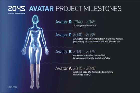 2013年6月,俄罗斯企业家伊斯科夫在纽约举行的“全球未来2045”国际会议上发布了一个机器人头颅,以伊斯科夫本人为模型。他的目标是将人类意识转移到机器人身上,通过机器人化身实现永生,或者至少将摆脱人类躯体的限制。