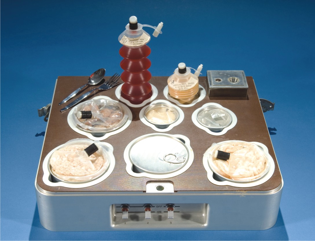 航天员第一次不用从“牙膏”里吮吸食物是在1968年12月,当时进行登月彩排的“阿波罗”8号飞船为航天员提供了餐具,他们可以像样地吃饭了。登月航天员像在地面上一样一日三餐。食品有三种:脱水食品(吃前要用水泡开),胶状食品(类似果冻,可以用勺吃),此外还有部分定量包装的份饭。但是,航天员对这些食品并不满意,带上去的食品常常出现剩余,航天员的健康水平也在下降。因此,不得不对航天食品进行改进。