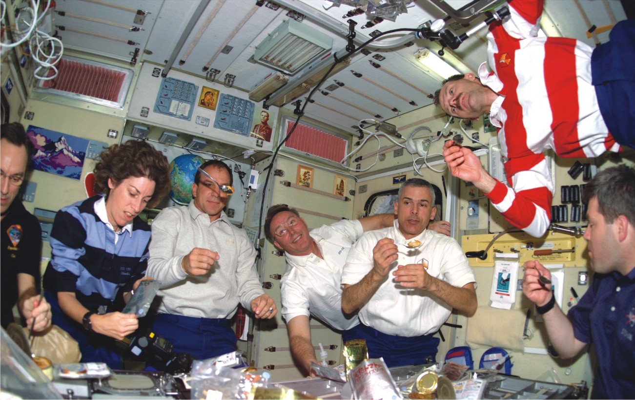 到了80年代,美国步入航天飞机时代。航天飞机每次执行任务要飞行7至30天,乘员数量达到6至7人。多人多天的航行促使航天食品达到“令人满意的水平”。航天飞机中安装了更为适用的“太空厨房”,说是厨房,实际是一个多功能的食品加工和贮存柜。贮存柜中有食品贮箱、调味品贮箱、加热器、分水器、餐具箱、清洁卫生用品箱和废物箱。此外,还有一个可以折叠的专门为了制备食品的台子。航天员在飞行中按照菜单进餐,菜单上的食品保证一周内不重样。航天员可以根据自己的爱好点菜。由于失重,胃里的东西会比在地面上飘得高一点,因此,航天员会比在地球上更容易感到饱。应对方法是一日多餐,一餐少量,加上大量点心和零食。此时,由于载人航天器食品冷藏设备和加热装置的发展,航天食品的类型和品种已接近地面膳食。