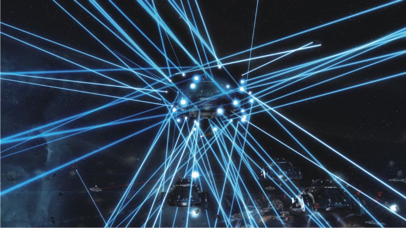 这样的场面与科幻片中的经典画面大相径庭,我们将不会看见透明的防护罩如保护胚胎的蛋壳一样将战舰包裹。此时的战舰更类似一条紧急逃生的深海鱿鱼,在漆黑的背景中,朝着自己身体的一侧吐出一口华丽的光雾,形成了一片局部的危机缓冲域。战舰也借此机会暂时干扰了敌人对目标方位的判断,为自己的战略转移争分夺秒。