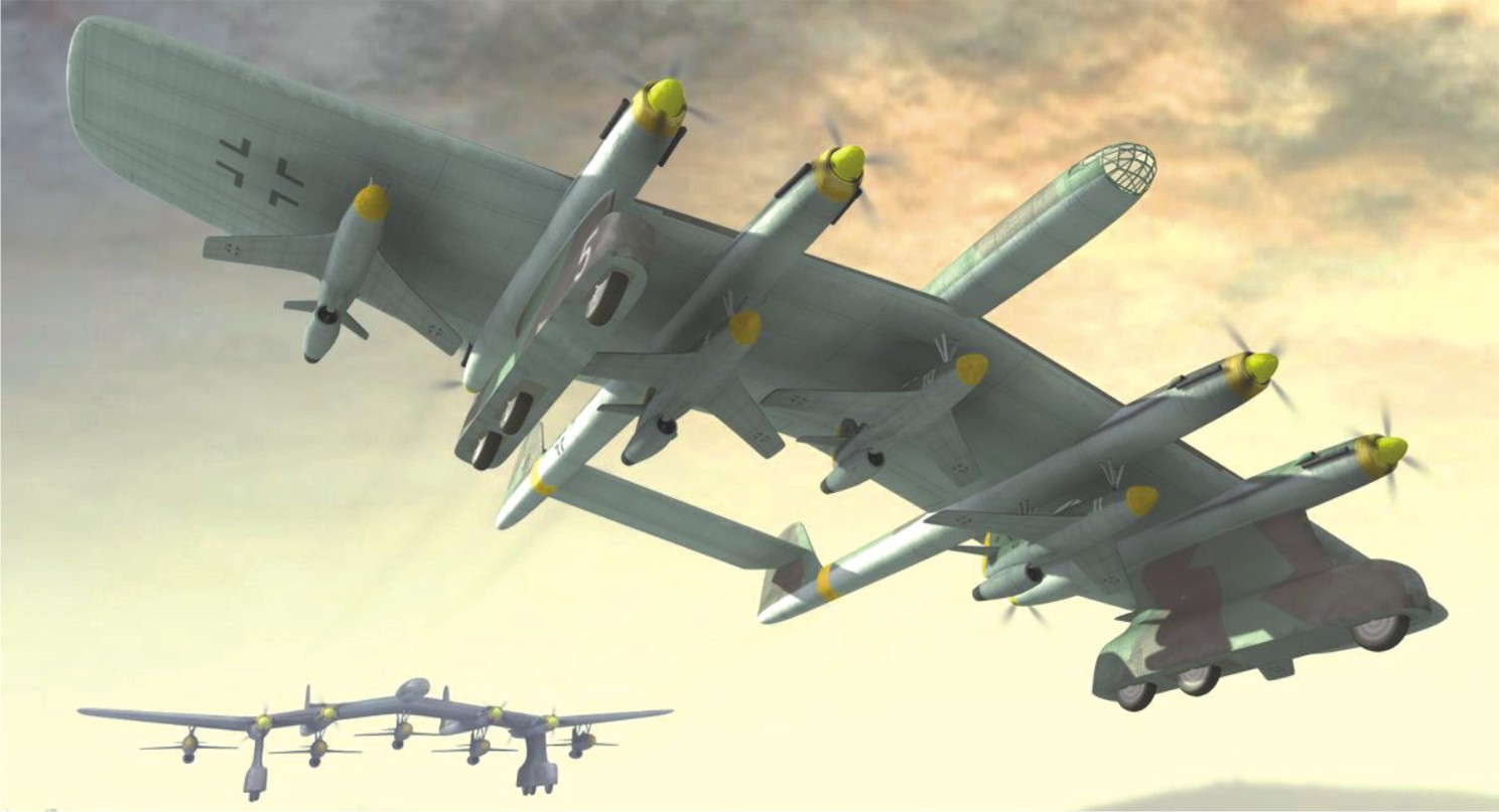 而“空中航母”则更富有想象力,竟然是将五架喷气式战斗机像挂炸弹一样挂在采用四台双向旋翼引擎的巨型飞机机腹和机翼下,用以拦截敌军轰炸机于国境之外。