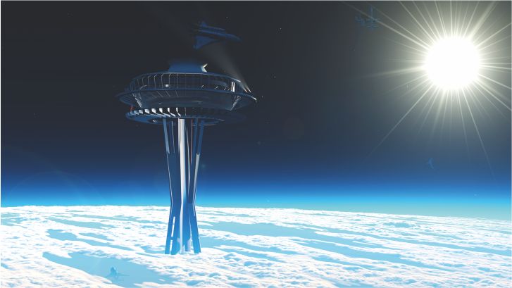 宇航员也将乘坐太空电梯升到20千米高的平流层,然后从电梯塔顶平台搭乘航天器起飞,只需要一级助推火箭就可进入近地轨道。执行完任务后,航天器还可以返回塔顶平台,补充燃料再重新起飞。