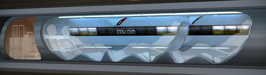 顾名思义,真空管道运输(Evacuated Tube Transport)的原理相当简单:胶囊状的乘客舱被置于直径1.5米的真空磁悬浮管道中高速行驶。管道中的空气被完全抽走,乘客舱在管道中几乎不受摩擦力的影响。线性电动马达将乘客舱提升到指定速度后,乘客舱就会依靠惯性在真空管道中行驶。乘客舱在抵达终点前减速,动能又被转化为电能。同样用一千瓦时电力,真空管道的运输能力是电动汽车或火车的五十多倍。