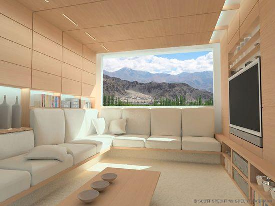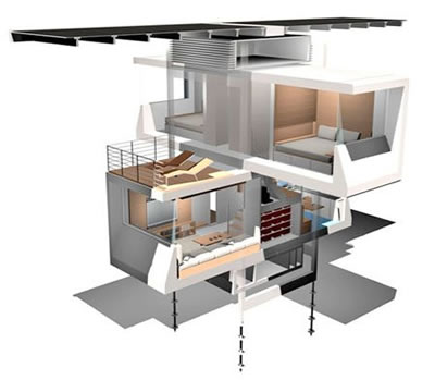 纽约的斯贝什·哈普曼建筑公司设计了这座极富科幻味的房子。太阳能电池收集的能量转化成电力,供家庭使用;积聚的雨水存储到容量为2700加仑的水箱里;有机垃圾被压缩进房子下面的一个“消化池”,肥料每年清理两次。房间的全部功能都是自动的,一台中央电脑控制着所有传感器,能够根据居住者的不同生活习惯作出调整。