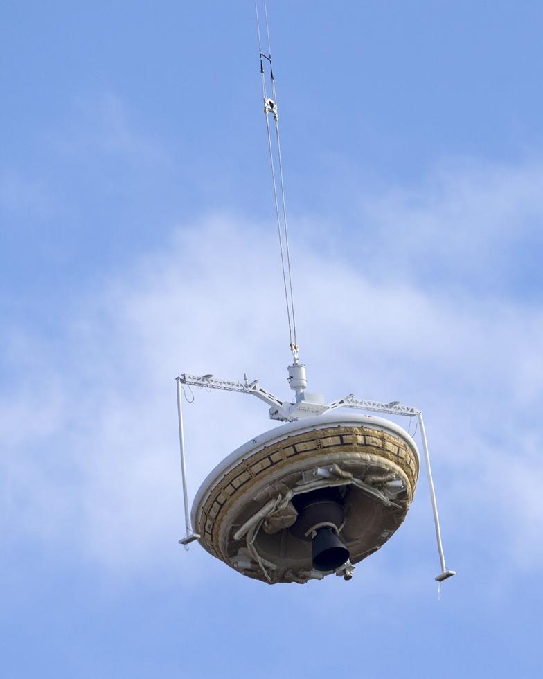 专家认为,测试的目的是模拟航天器飞入火星大气时的高度和速度,为未来大型航天器在火星着陆做准备。图为测试结束后,火星“飞碟”被从海洋里打捞起来。