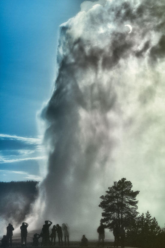 在美国黄石国家公园中,摄影师罗伯特-豪威尔捕捉到间歇泉喷发时如同万马奔腾的景象,数十米的高度竟然覆盖过了月亮,一边是银灰色的蒸汽、一边是蔚蓝色的天空,对比之美令人赞叹。