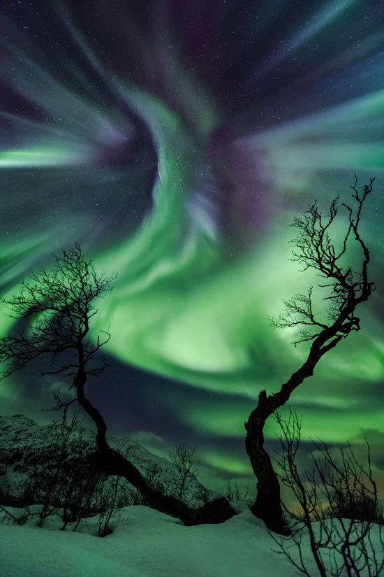 日冕物质抛射(CME)在挪威造成强烈的北极光,枯朽的桦树在光冕之下如同怪兽。