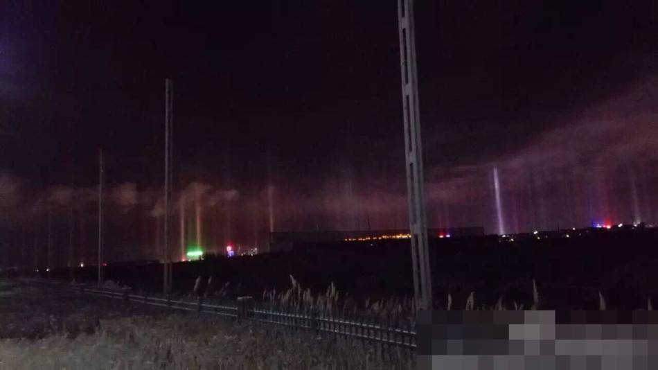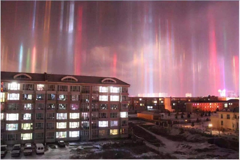 2015年12月30日晚,内蒙古锡林浩特出现日柱现象。当天气很冷而太阳正好升起或落下,冰从高层落下时,会形成平板,形状就像是一些冰晶。冰晶反射的阳光几乎完全是垂直的,因此产生日柱效应。
