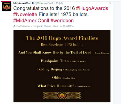今年获得雨果奖中短篇奖提名的作品一共有五篇,将于8月下旬由1975名读者参与投票选出。当被问及是否有信心获奖时,郝景芳给出了一个实在而又理性的回答:“也谈不上有没有信心,反正就是五分之一的几率吧。”