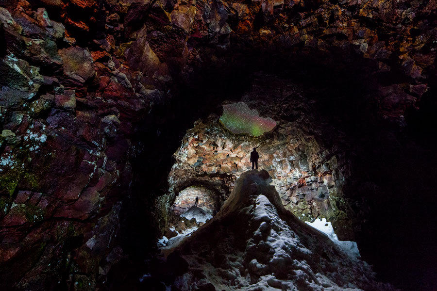 冰岛摄影师因戈尔夫在冰岛1300米深的洞穴中仰望星空,极光闪烁、白雪飘落。