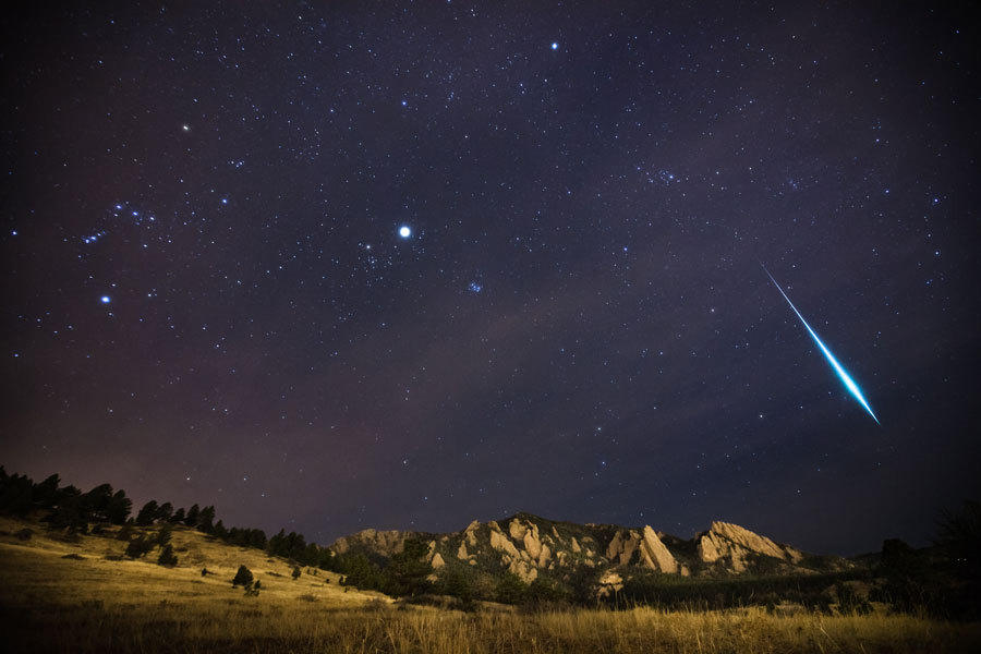 双子座流星雨划过熨斗山,美国摄影师帕特里克-卡利斯捕捉到其中难得一见的“大流星”,璀璨的夜空中猎户星座和木星也清晰可见。