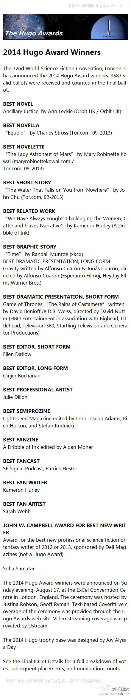 最佳长篇颁给了Ann Leckie的长篇处女作《附加正义》(Ancillary Justice),这是她的太空歌剧三部曲Imperal Radchd的第一部,此前还获得了英国科幻协会奖、克拉克奖以及星云奖。最佳短篇由华裔作家朱中宜(John Chu)获得。完整获奖名单如下: