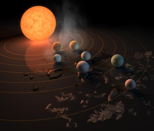 美国宇航局宣布在一颗近距离小质量恒星的周围发现多达7颗大小与地球接近的系外行星,并且这几颗行星相互之间的距离很近,基本都位于这颗恒星周围的宜居带范围内,因此理论上都有可能存在大气和海洋