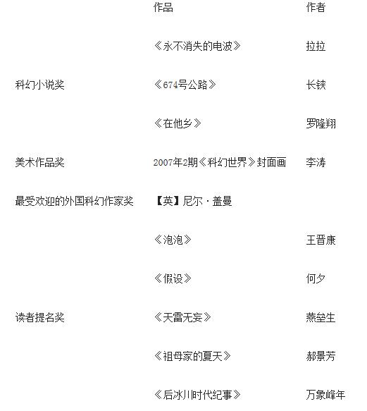同时,第十八届银河奖举办,“中国科幻银河奖”正式更名为“银河奖”。在原有的“科幻小说奖”和“年度最受欢迎的外国科幻作家奖”基础上,增设三项大奖,即长篇奇幻小说奖、中短篇奇幻小说奖和科幻美术奖。本届获奖名单如下: