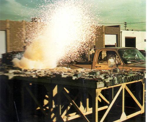 第一颗死星不仅在电影里是庞然大物,在现实生活中也是如此——或许没月亮那么大,但……为了得到恰当的光芒,从而使堑道疾飞时沿途的爆炸看起来更逼真,摄制组把那块表面放到了ILM的停车场。因为这一烟火效果必须在高速摄影的条件下捕捉。为了拍摄那些需要额外高速的镜头,他们把一个摄影机装在了模型师史蒂夫·高利(Steve Gawley)的新卡车后面,然后让他在爆炸发生时从模型旁边开车经过。