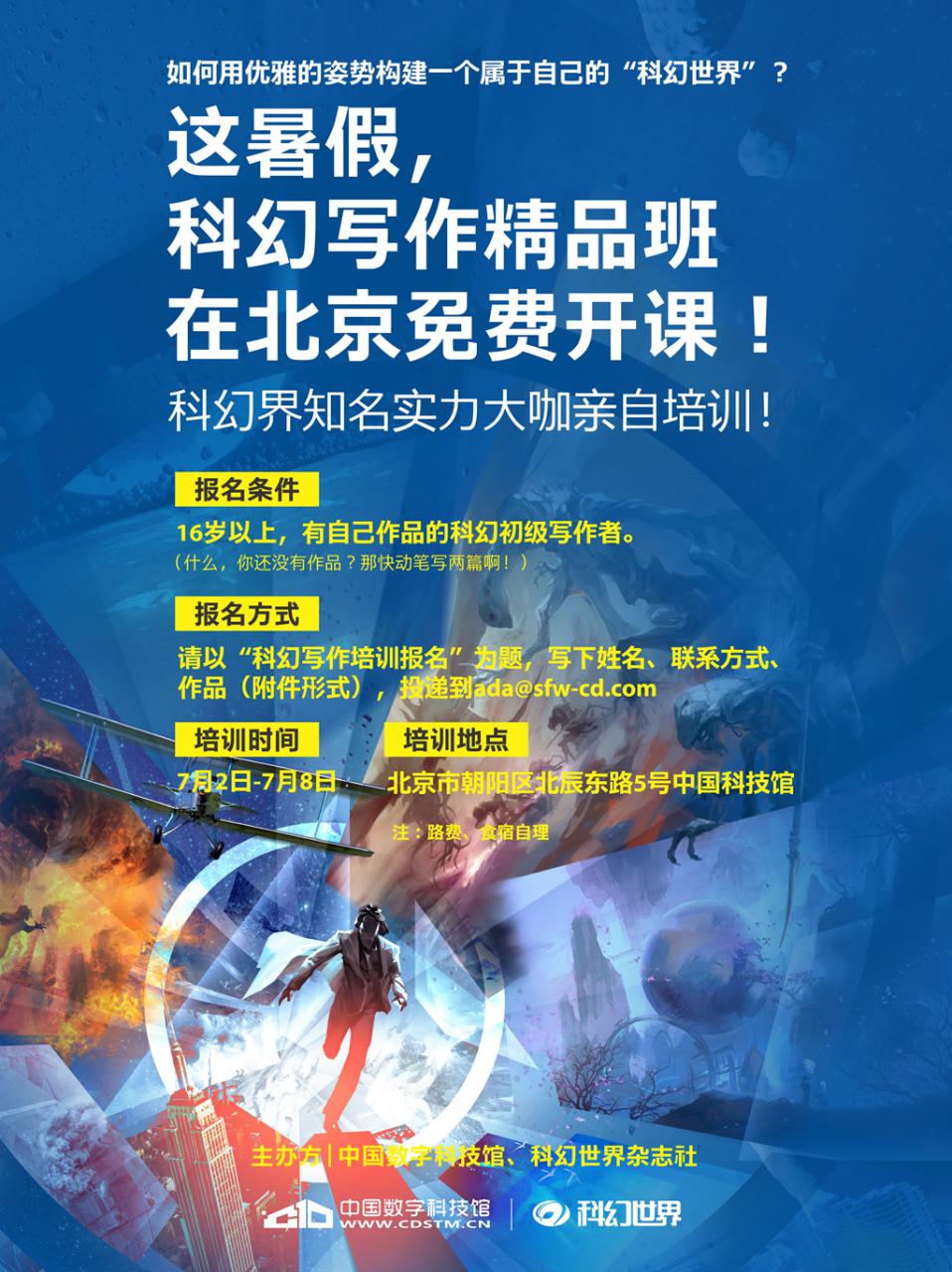 报名方式:请以“科幻写作培训报名”为题,写下姓名、联系方式、作品(附件形式),投递到ada@sfw-cd.com