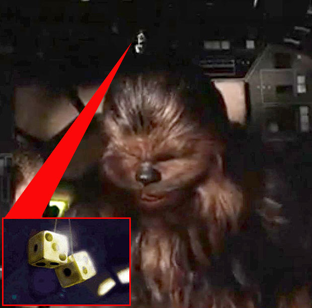 《新的希望》中,在“千年隼号”的驾驶舱里能看到一对骰子。这对骰子在格雷格·鲁卡(Greg Rucka)的正史小说《走私者的奔波:汉·索洛与丘巴卡历险记》(Smuggler’s Run: A Han Solo & Chewbacca Adventure)中得到了解释。丘巴卡似乎在多年前将一对“新奇的随机骰子”作为玩笑挂到了驾驶舱里。