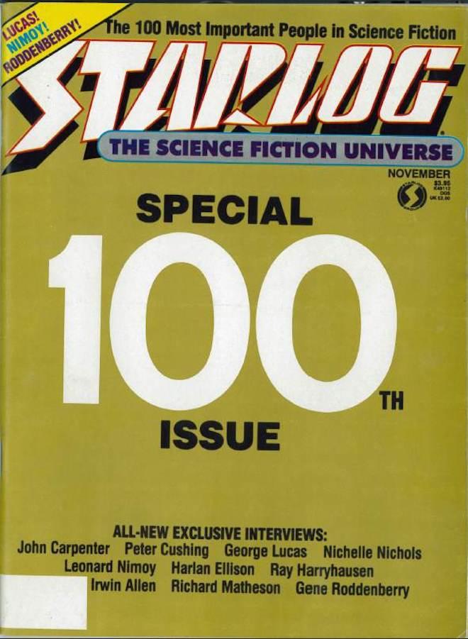 1976年8月发行了该杂志的第一期。1985年11月出版的第100期杂志无疑是《Starlog》的一个里程碑。杂志搞了一个“科幻史上最重要的100人”大专题,这其中包括了多位在科幻影视文化领域具有超强影响力的人物:JohnCarpenter, PeterCushing, GeorgeLucas, HarlanEllison, LeonardNimoy,GeneRoddenberry。
