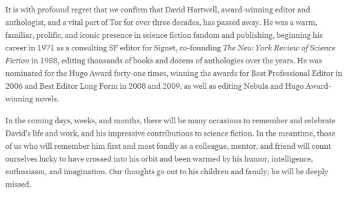 “对于David Hartwell的离世我们感到无比深刻的惋惜,他是一位备受赞誉的编辑、文选编者,同时三十多年来也是Tor至关重要的一员。他热情、亲切、成果丰硕,是科幻爱好者以及出版界的标志性人物,他在1971年以一位Signet的科幻编辑顾问开始了自己的事业,在1988年创建了纽约科幻评论,多年来编辑了上千本书出版了许多科幻文集。被雨果奖提名41次,在2006年获得最佳职业编辑奖,2008和2009年获得最佳长篇编辑,同时也编辑过多篇星云奖和雨果奖获奖小说。