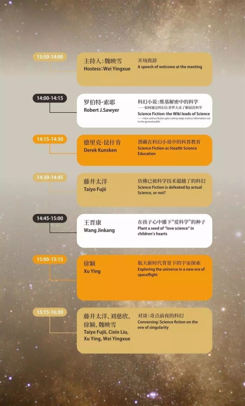 据悉,本次专题论坛是2018世界公众科学素质促进大会上开展的系列专题论坛之一,充分体现了本届大会对科幻文化的关注与重视。在此契机下,本次论坛邀请了刘慈欣、王晋康、徐颖、罗伯特·索耶、德里克·昆什肯、藤井太洋等六位国内外知名科幻作家及研究专家,通过“奇点前夜的科幻”、“航天新时代背景下的宇宙探索”等一系列主题发言,为广大的科普、科幻爱好者充分展现了一场科学与幻想的“盛宴”。