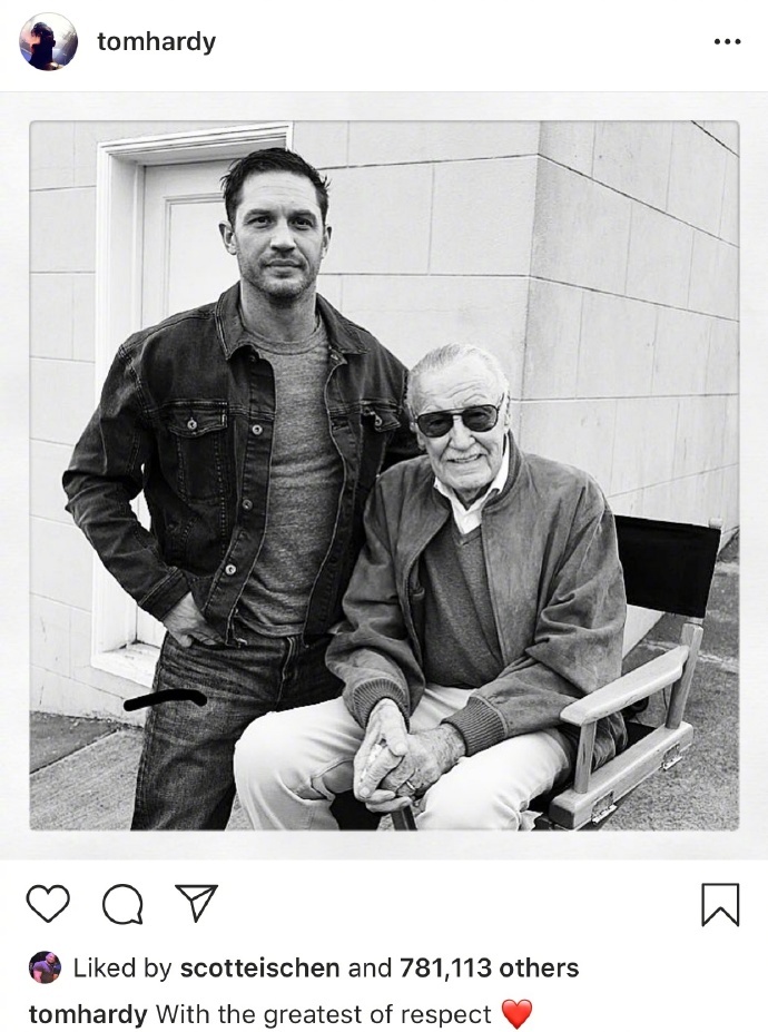 在热映大片《毒液》中与斯坦·李合作的汤姆·哈迪也第一时间发文:“带着最深切的尊敬”,并配上了两人在片场的合影。在《毒液》中,斯坦·李在结尾出现客串了一位遛狗老人。