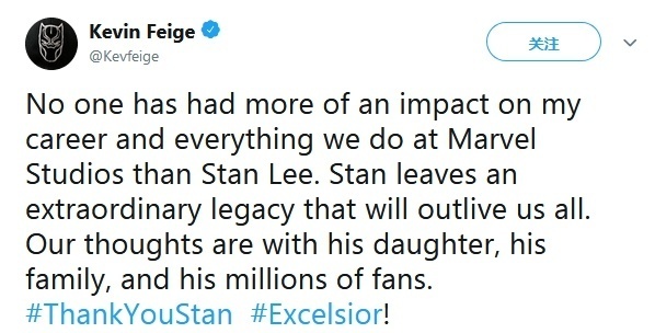斯坦·李的个人官方推特账号发布去世消息,黑底白字写道:“1922-2018,Excelsior!(精益求精)”“Excelsior”是斯坦·李在做编辑时喜欢在文尾加的拉丁语字,代表超越、更强。