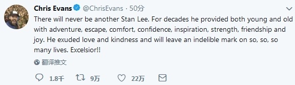 “美国队长”克里斯·埃文斯说:“斯坦·李是独一无二的,几十年来他给予了老老少少们冒险、逃离、安慰、信心、灵感、力量、友谊和愉悦。他传播着爱和善良,并将在无数人生命中留下不可磨灭的印记。Excelsior!!”