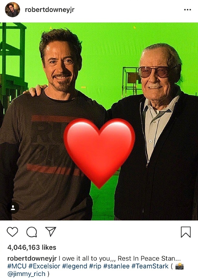 “钢铁侠”小罗伯特·唐尼晒出与斯坦·李在绿幕前的合影并配上红心“示爱”:“我欠你的太多了,安息吧!斯坦。”