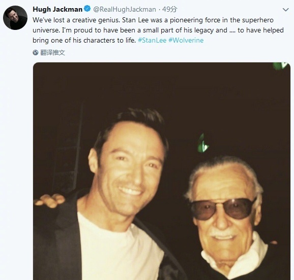 “金刚狼”休·杰克曼说:“我们失去了一位创意天才,斯坦·李是超级英雄宇宙的先驱,我很骄傲能传承他一小部分精神遗产,将他笔下的角色演绎出来。”