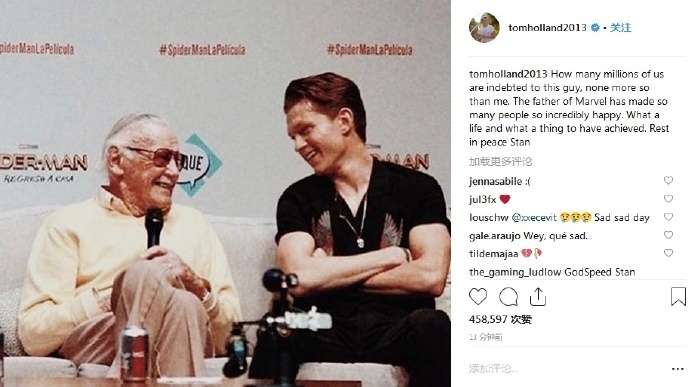 “小蜘蛛”汤姆·霍兰德:“数不清有多少人曾从他身上获益,他给无数人带来了欢乐,这是多么伟大的人生和成就啊!安息吧,斯坦。”