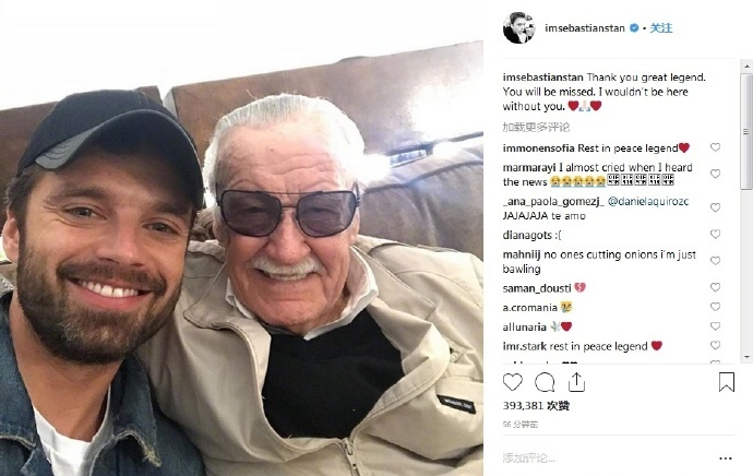 “冬兵”塞巴斯蒂安·斯坦悼念斯坦·李:“谢谢你,伟大的传奇,我们会想念你。没有你,就没有如今的我。”