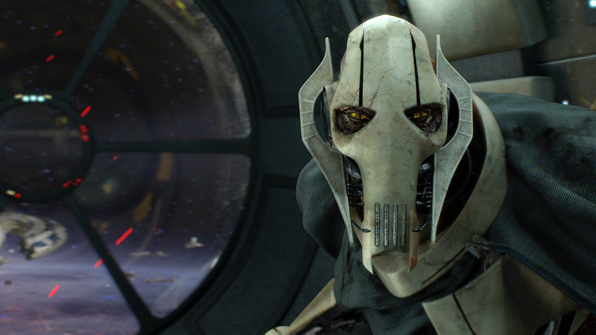 一副骷髅状的面具遮在脸上,格里弗斯将军活像个巨大的节肢动物,他在自己的机械仆从们簇拥下显得十分高大。自从克隆人战争期间站在分离分子一边后,他便将恐惧深深植入了敌人们心中。更不用提那四把藏在斗篷下,用来纪念被他杀害的绝地的光剑了。他的斗篷已经破烂不堪,用来遮蔽他残破的骨架般的躯体。他胸腔中隐约可见的黏液囊,以及时不时从身体内部透出来的尖锐咳嗽声更平添了一份恐怖。