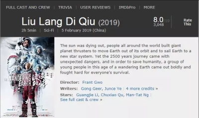 在IMDB上,《流浪地球》获得了8.0的好成绩