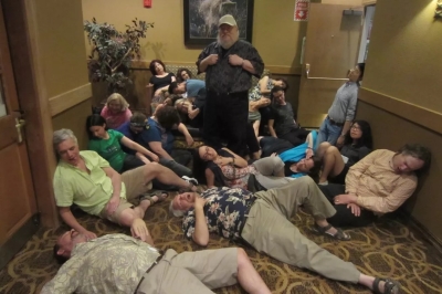 与马丁合照,“血色写作营”(大家都“挂了”,唯独他站着)