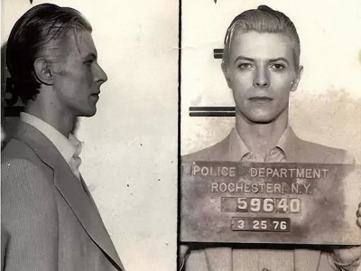 △1976年因随行人员持有大麻,且聊及“哪能弄到可卡因”,鲍伊与同行人被捕,留下这一经典照。