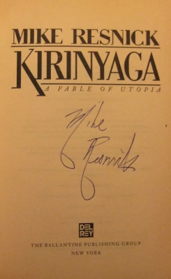 我第一次见到迈克是在2009年11月在我居住的城市纽约州罗切斯特的科幻年会Astronomicon上。迈克那次是作为特邀作家嘉宾参加的年会。对于我来说,参加这次年会只要能见到心目中的偶像就心满意足了。所以只要有迈克的报告或者小组讨论我都会尽量去听,凑到机会拿着早就准备好的迈克的代表作《Kirinyaga》去找他签名。迈克非常爽快地给我签了名,并跟我聊了一阵,我给他作了自我介绍,就这样我认识了迈克。那时我是带着10岁的儿子牧星参加的年会并一起见的迈克,我告诉迈克牧星也很喜欢写作。
