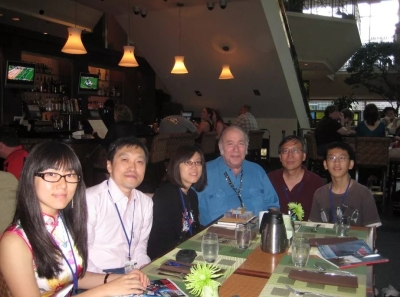后来在科幻大会上我们顺利地见面一起吃了午饭。午饭前聊天期间不知是谁问起他那挂会员证的吊带上为什么别着那么多小火箭(雨果奖杯都是火箭的形状),他马上用手托着给我们看说,这每个小雨果奖杯代表他一次雨果奖提名,那吊带上一共有三十六个!我问他这是不是一项世界记录,他笑着说:是啊,不过这也说明我争夺雨果奖失败的也最多!