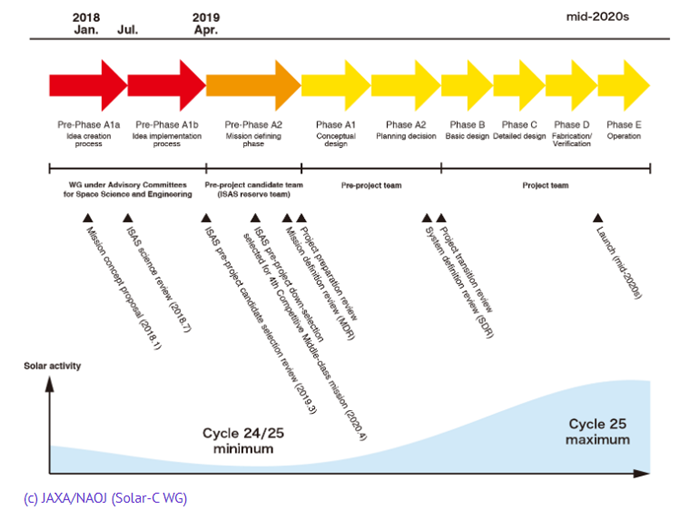 为了响应JAXA竞争性的中型重点任务(2017年9月)的呼吁,Solar-C工作组提出了Solar-C_EUVST的任务概念(2018年1月)。ISAS决定将该任务逐步升级到A1b阶段(想法实施过程)。在通过国际科学审查(2018年12月)和ISAS项目前候选人甄选审查(2019年3月)之后,Solar-C_EUVST从2019年4月开始进入预阶段A2(任务定义阶段)。