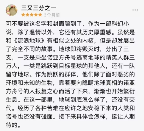 幻迷伊库塔:我希望自己是伊恩,我对他的心情非常熟悉。为自己的懦弱感到强烈的后悔,但又为能给心上人一个惊喜而感到心情雀跃。哪怕他自己知道此生与心上人再相见的概率约等于零。这种跨越了172光年,相隔数代人的重逢无比的浪漫,届时两个人可能已经逝去了,但总有什么会留下来并且相遇的吧?