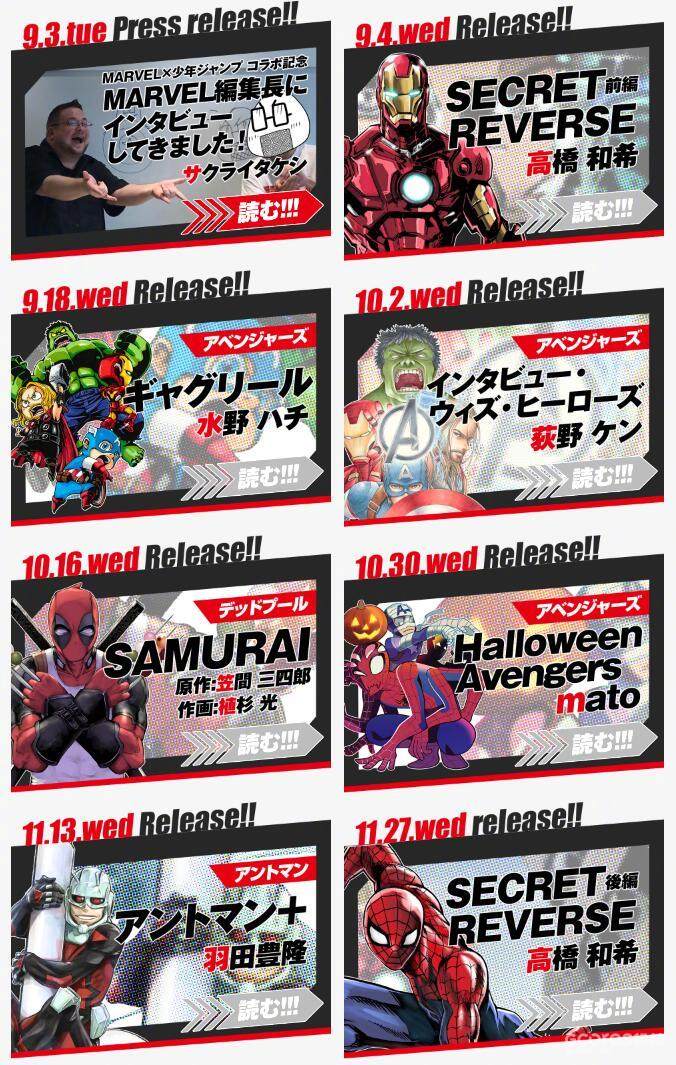 由《少年JUMP》的漫画家们绘制的、以漫威角色为主角的短篇漫画将于9月3日依次在web漫画志《少年JUMP+》开始连载。首部作品为《游戏王》作者高桥和希绘制的钢铁侠&蜘蛛侠来到日本的故事,题目为《SECRET REVERSE》,前篇将于9月4日公开,后篇发布时间为11月27日。
