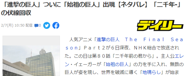 超人气漫画《进击的巨人》已经完结,TV动画最终篇已经开播,2月6日晚间第80话《来自二千年前的你》播出,引发热议,熟悉本作的粉丝或许还记得,本话的内容正是对于2013年的第一话题目伏笔的兑现。