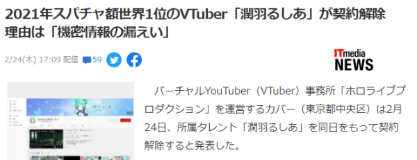 著名虚拟油管偶像经纪事务所hololive工作室于2月24日今天宣布,今日起与旗下目前排名世界第一的虚拟油管偶像润羽露西娅正式解约,同时给出的原因是“泄露机密”。