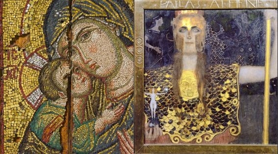 * 左为13世纪的圣母玛利亚金片拼贴壁画,右为克林姆特的作品《女神雅典娜》