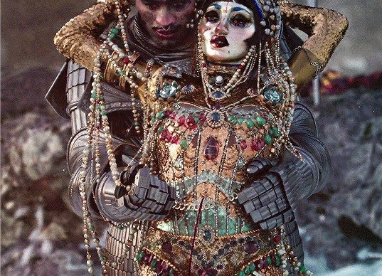 作为美洲土著,“吉巴罗”们创造了与世隔绝的文明和灿烂的物质\文化财富,直到西班牙殖民者的大炮击碎了热带雨林的寂静。片中满身金箔的女妖与贪婪粗暴的骑士形象,系出于此。