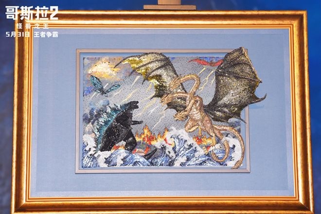 此次打造的“怪兽之王争霸图”匠心独运,采用了中西融合的刺绣手法,另辟蹊径“绣”出了一幅中国风海报。这幅作品由中国艺术家张晓星和宋亚樵耗时856个小时打造而成,使用材料多达117种,其用料极其考究,结合了花样珠、水晶、亮片、金箔与米珠等闪亮素材,再搭配蓬松的绒线、细滑的蚕丝、夜光颜料等,大量运用铺棉、手缝、长短针、缎面绣等传统针法,辅以金扁丝和金属线封边,最后用陶塑赋予哥斯拉双臂以力量的美感。整幅作品不仅拥有独特的立体感,同时于奢华贵气中不失怪兽形象的威严感、压迫感及史诗感。